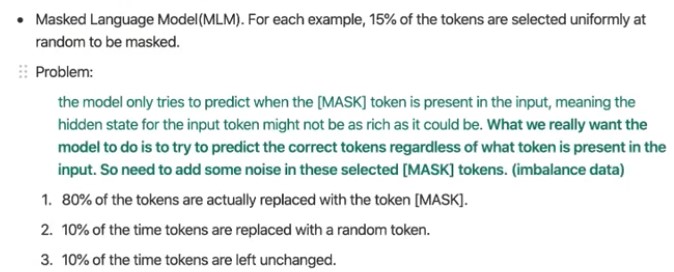 BERT通过掩盖15%的tokens来进行训练,目的是猜测它们。另一个目标是预测下一个句子。